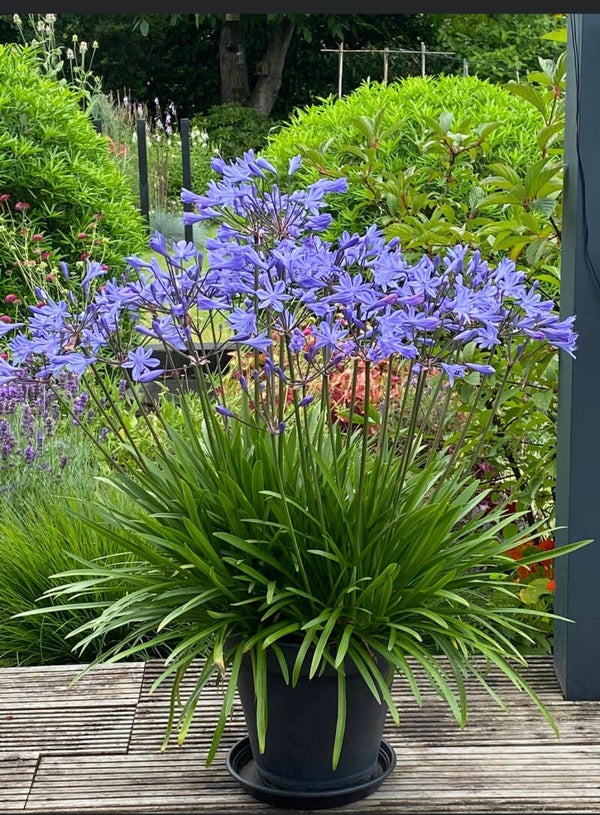De Agapanthus ook wel bekend als kaapse lelie, is een decoratieve plant met prachtige diep-blauwe bloemen. Een prachtige vaste plant. Het blad is diep- donker groen van kleur en groeit in rozetten. De bloemen bloeien op lange stevige stelen. Na de bloei blijven de zaden nog tot ver in de winter decoratief. Kortom dit is een mooie blikvanger in een border of bloembak. De Agapanthus is winterhard. De bloemen kunt U als snijbloemen gebruiken.