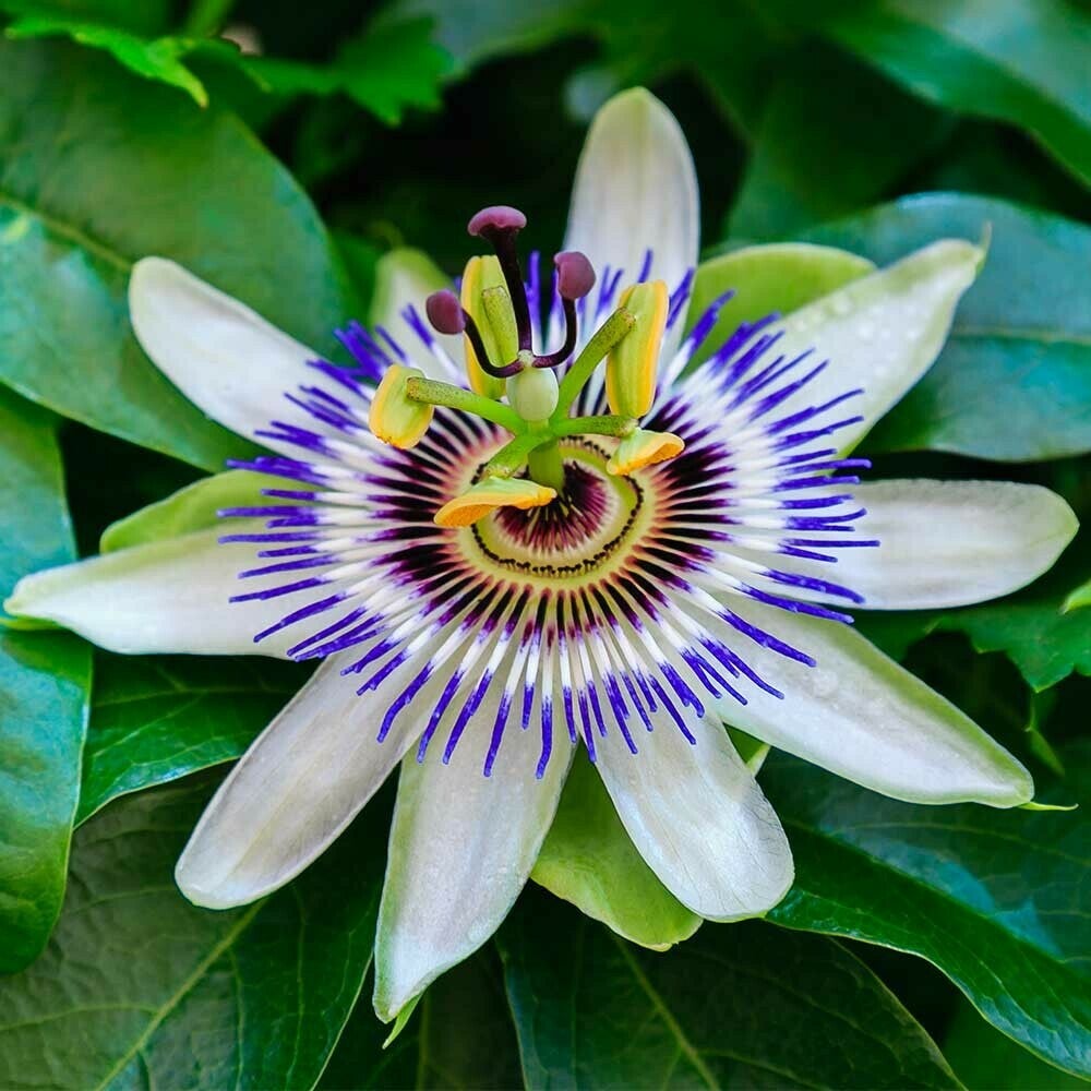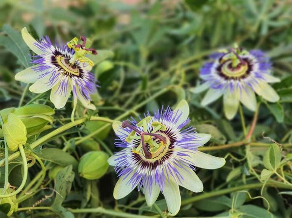 Passiebloem (Passiflora caerulea) is een klimplant met prachtige bloemen, de Passiebloem Caerulea heeft een melkwitte bloem, met een lila/blauwe kroon en groen/paarse stampers. De Passiebloem caerulea is, net als andere soorten uit de Passiflora familie, een goede klimmer die met de jonge scheuten zich om de leidraad, pergola, of takken van andere planten wikkelt en zich na voldoende houvast met grotere scheuten om deze houvast hecht. De Passiebloem caerulea heeft een standplaats nodig met volop zon, en zal zijn zonnige plek belonen met een uitbundige bloei. De passiebloem kan tot 3 meter hoog worden. Bij gebruik langs een schutting of andere afscheiding is het aan te raden 3 planten per strekkende meter te gebruiken om een mooi vol resultaat te bereiken. De Passiebloem winterhard.