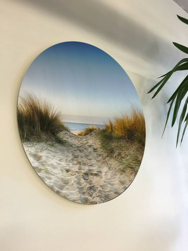 Sand dunes in the Netherlands is op hout gedrukt. De diameter van dit ronde houten schilderij is 58 cm.