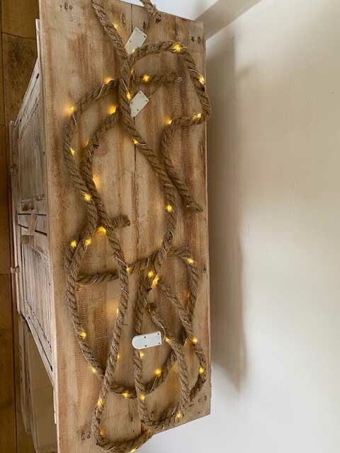 Kwalitatief dik Jute touw met LED lampjes. 1,5 meter lang stevig touw van 1,2 cm breed met 20 warm witte LED lampjes.