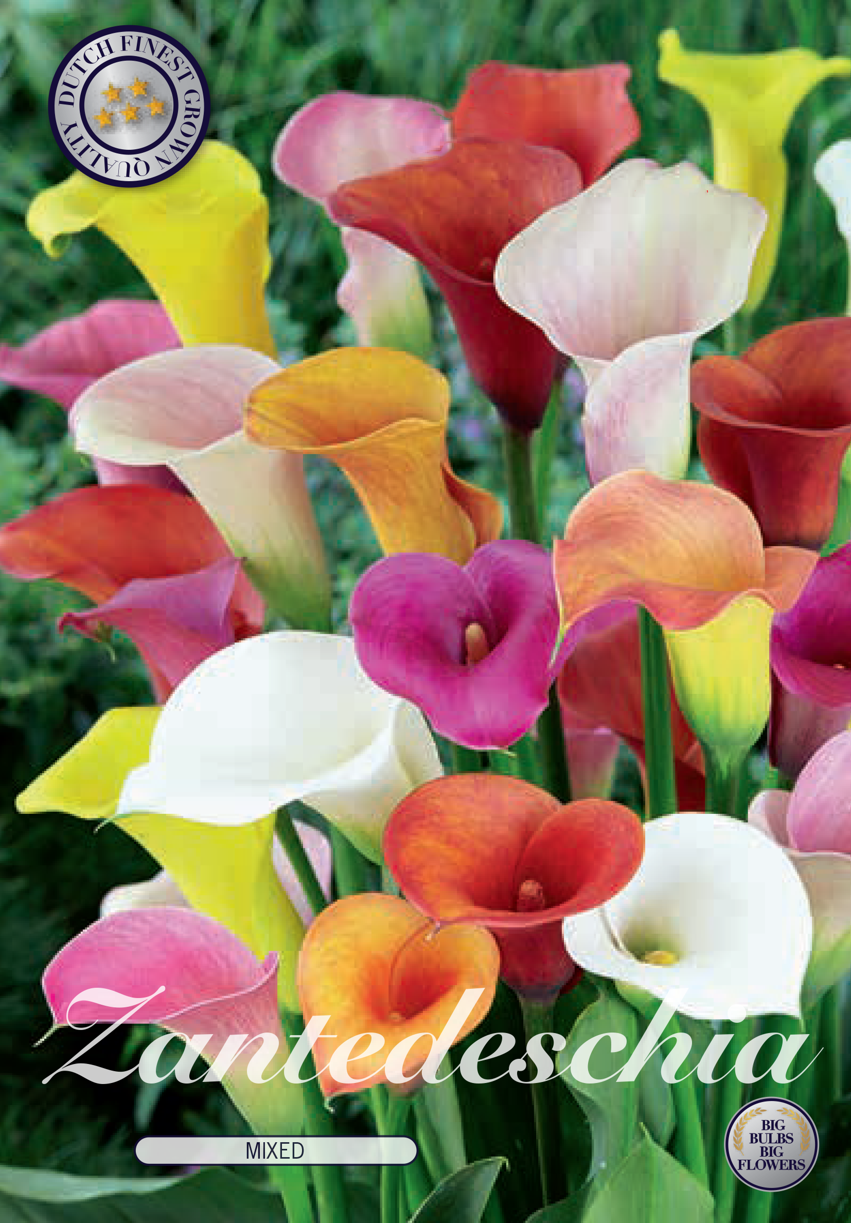 Het blad en de kelken van de Calla staan fier omhoog en de plant heeft een hoogte van van 40 tot 55 centimeter.De pijlvormige bladeren zijn heldergroen, waartussen stelen met trechtervormige schutbladeren uitkomen. Deze zijn er in diverse kleuren.